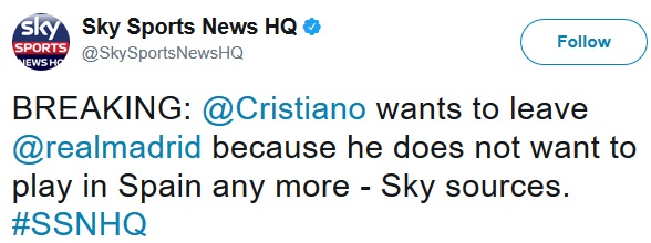 Cristiano Ronaldo wants to leave Real Madrid because he does not want to play in Spain any more, Sky sources understand.
