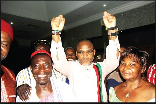 IPOB leader, Nnamdi Kanu raising his hands after he was released from prison