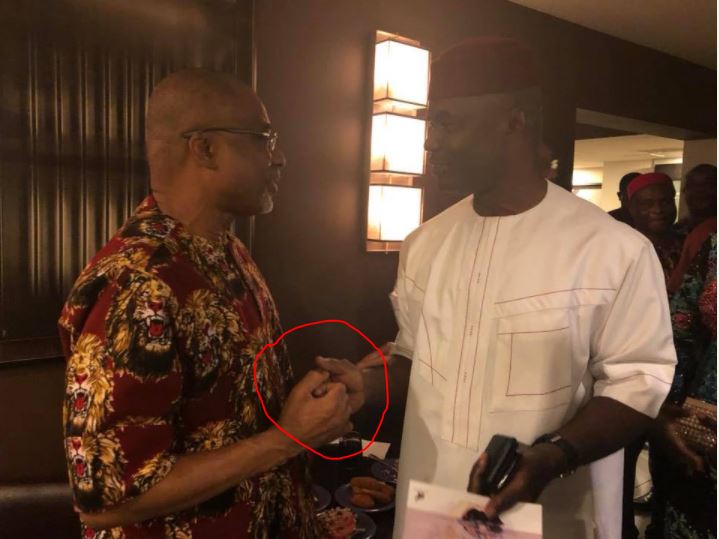 "clawing" handshake while greeting the deputy governor of Abia state;