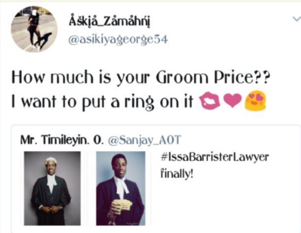 proposed marriage to a young lawyer, Timilehin who just graduated from