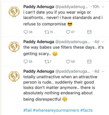 Paddy Adenuga just revealed on twitter that he can never date a lady that wears wig and those are just few of his standards.
