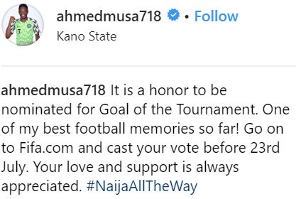 Consequently, the striker took to his Instagram page to reveal that it is an honour to be nominated.