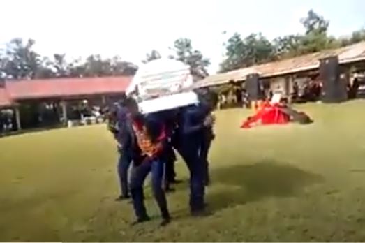 A video has emerged online showing the moment a dead body fell from inside its coffin during a funeral in broad daylight.