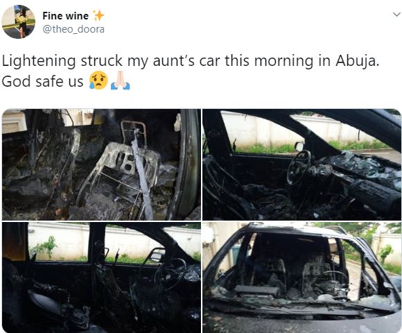Photos have emerged on social media showing the damage a lightning strike did to a car in Abuja.