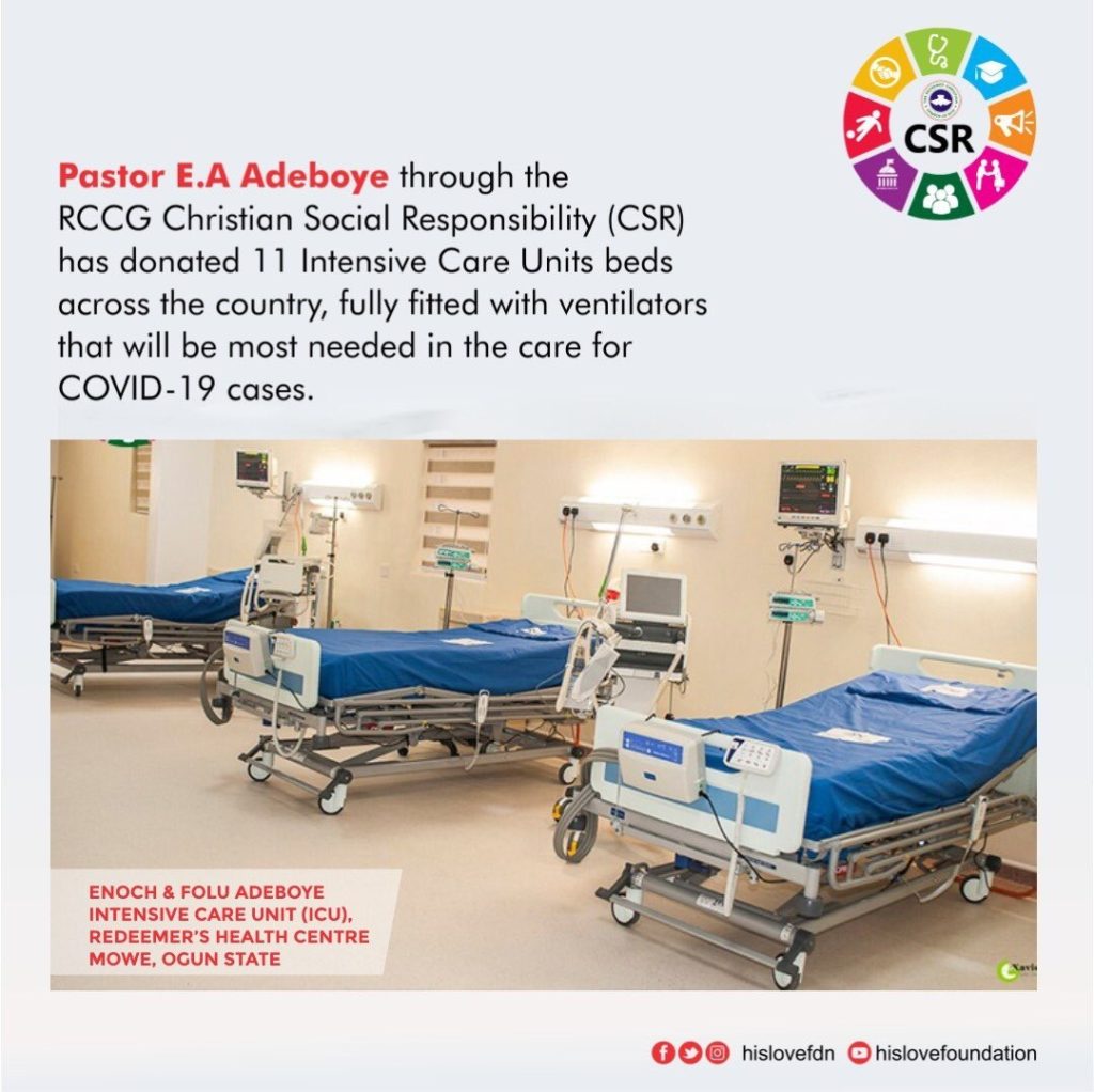 @PastorEAAdeboye through the RCCG Christian Social Responsibility @rccgcsr has in times past donated 11 Intensive Care Unit beds across the country,fully fitted with ventilators that will be most needed in the care for COVID-19 cases.#RCCGCSR#HisLoveFoundation #RCCGLOVEINACTION pic.twitter.com/sKdmkM1Cel