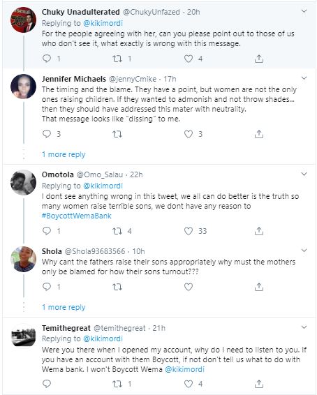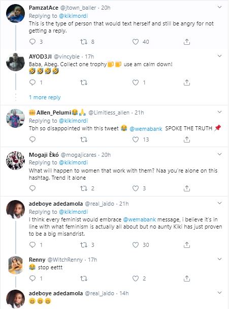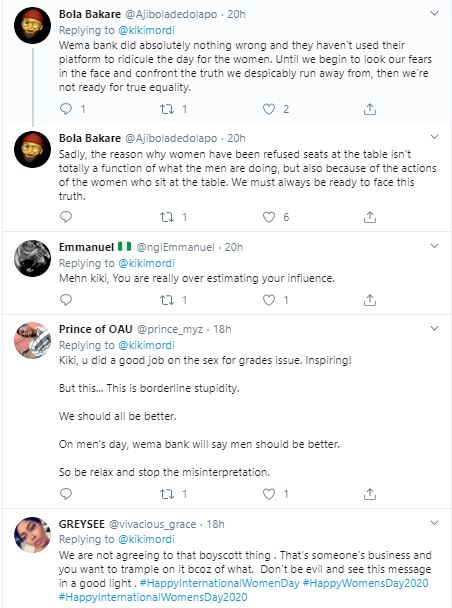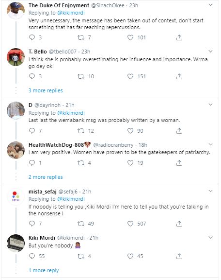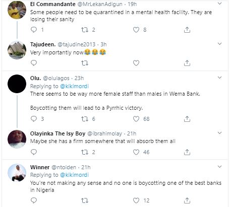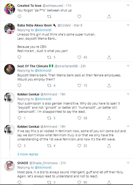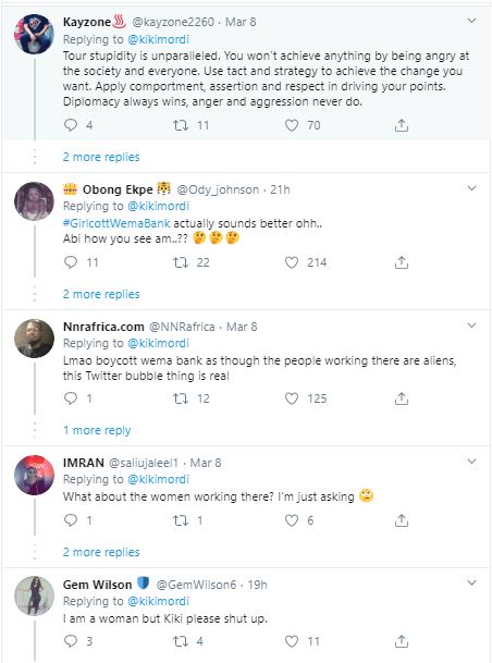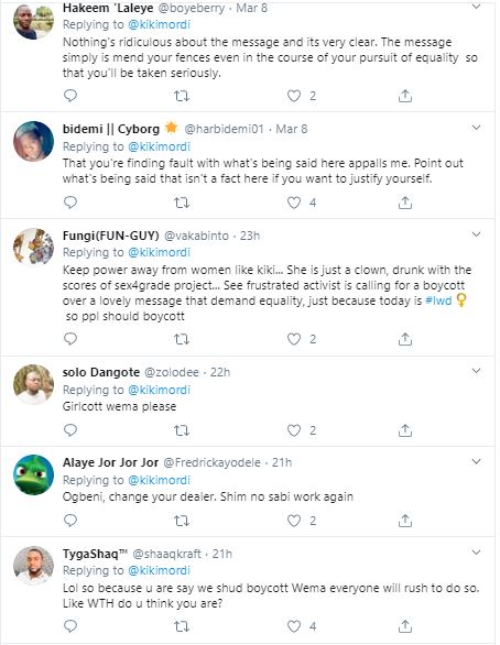 Nigerian Journalist and feminist, Kiki Mordi is getting it very hot on Twitter after she called for the boycott of Wema Bank.